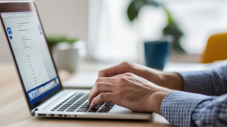 Close-up of hands typing on a laptop for productivity and work