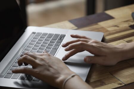 Close up view of female typing hands on laptop keyboard