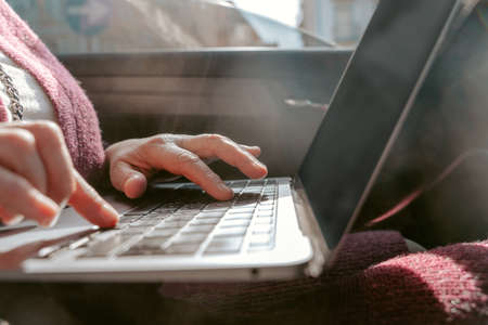 Close up woman hand typing on laptop outside in the car