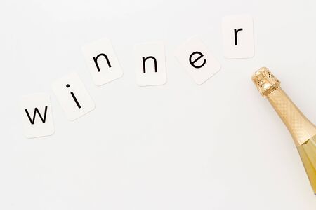 Winner is concept. Announcement design mockup with champagne on white background top view copy space