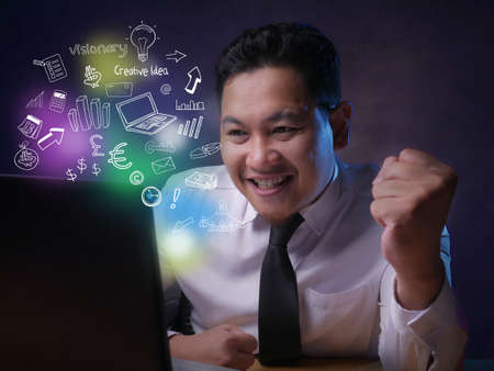 Young Asian businessman looking at laptop with winning gesture. Success achievement reaching target in business concept