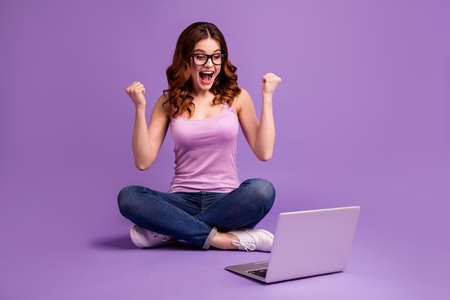 Portrait of delighted cheerful charming teen sit legs crossed raise fists scream, shout yeah wear denim jeans eyewear eyeglasses modern singlet isolated trendy stylish violet background