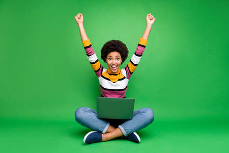 Full length photo of crazy funky afro american girl work laptop sit legs crossed win coworking deal scream wow omg raise fists wear denim jeans shine outfit isolated green color background