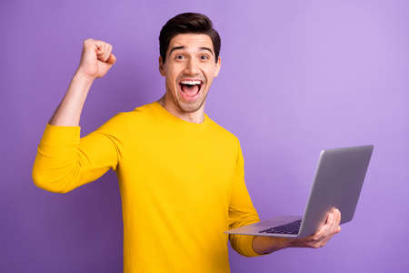 Photo of young crazy positive smiling excited man use laptop raise fists in victory success isolated on violet color background