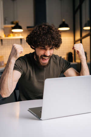 Vertical shot of cheerful excited young man looking at laptop screen screaming with joy raising hands, celebrating win or reading unbelievable news, sitting at table in kitchen with modern interior.
