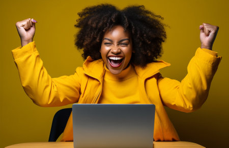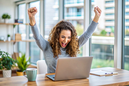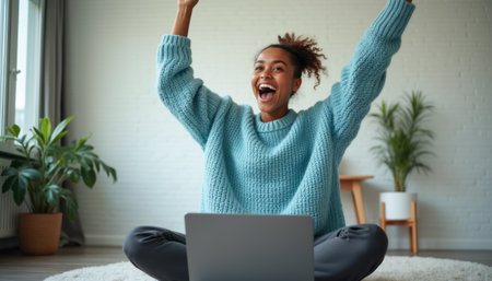 A young woman expresses joy and excitement as she celebrates a success while working on her laptop at home. Her cozy space inspires positive energy.