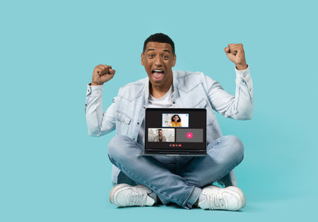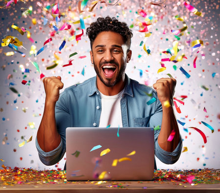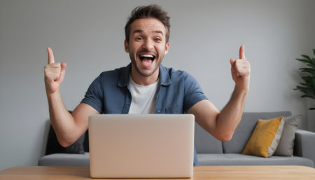 A joyful man celebrating a victory at his modern office workspace, showcasing his happiness and excitement while working on his laptop.