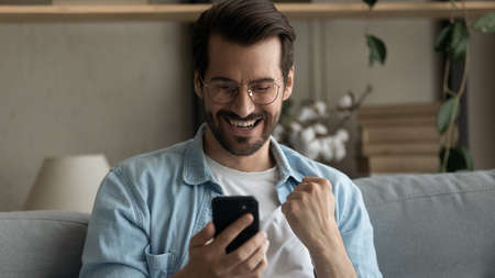 Overjoyed millennial Caucasian man feel euphoric win online lottery on smartphone gadget. Happy young male triumph celebrate good news on cellphone, get promotion or hiring notice on device.
