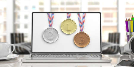 Set of medals - golden, silver and bronze - on a laptop screen. 3d illustration