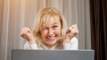 Blonde long-haired woman of middle age wearing warm white turtleneck smiles happily after reading good news using internet on laptop, sunlight.