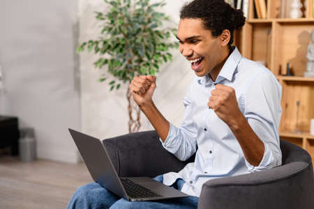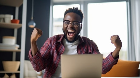 Generative AI : Happy excited little african american elementary school boy raising hands up and screaming with excitement during home distance education on laptop computer kid cel