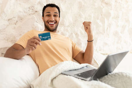Guy Using Laptop Showing Credit Card Gesturing Yes In Bedroom