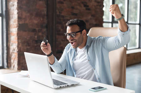 Young overjoyed mixed-race businessman with open mouth sitting at the desk in front of a laptop, holding a credit card, feeling happy due to a successful transaction or the significant sale discount