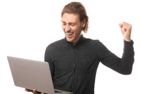 Excited businessman looking at the laptop screen and rejoicing. Happy guy screaming yes staring with mouth opened at monitor amused with unexpected opportunity