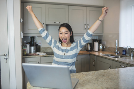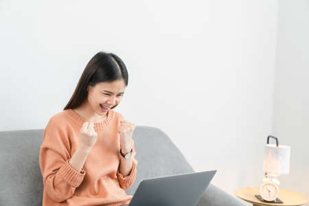 Young Asian woman using digital laptop with fist hand and excited for success.