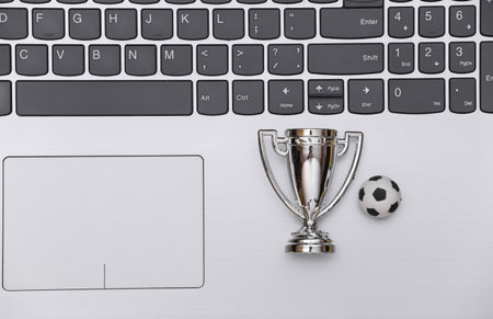 Online sports betting. Soccer ball and champion cup on laptop keyboard. top view. flat lay