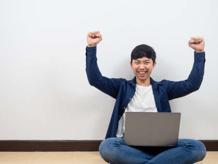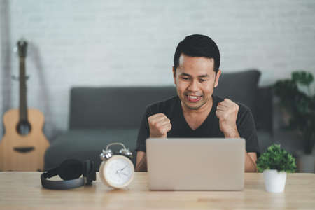 Happy young asian man sit work at wooden desk with pc laptop. Achievement business career lifestyle concept. doing winner gesture while looking at the laptop screen