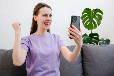 Girl winning on line lottery, received results online auction. Overjoyed young female sit on couch at home holds smartphone reading unbelievable news in sms, celebrate moment of victory feels excited