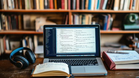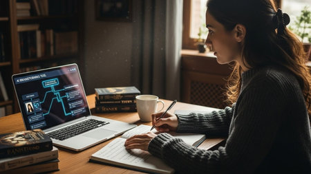 A focused student is using an AI brainstorming tool on her laptop, taking notes in a notebook. The scene is set in a cozy study environment with books and a cup of coffee.