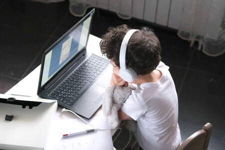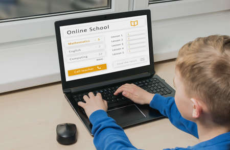 Distance learning online education. A schoolboy boy studies at home and does school homework. A home distance learning