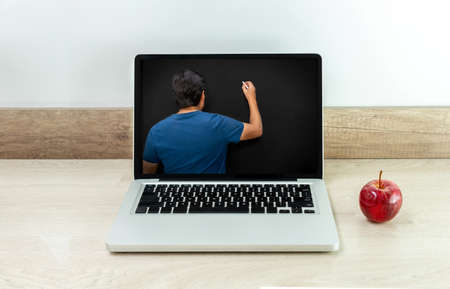 Laptop on a desk with an apple next to it and a teacher on his back writing on a blackboard on his monitor
