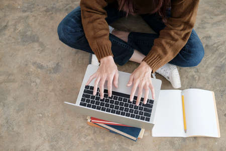 Woman hand typing labtop computer with online education on screen background, Education concept, E learning, technology and lifestyle concept