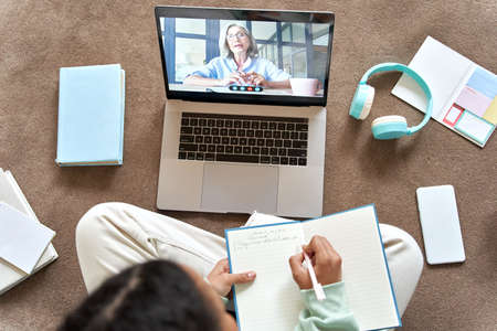 Young Asia teen girl student distance learning lesson with online teacher and study on laptop screen in living room at home night.