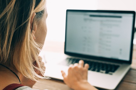 Studend of medicine searching for something using her computer. Back view of woman making video call with her doctor while staying at home.