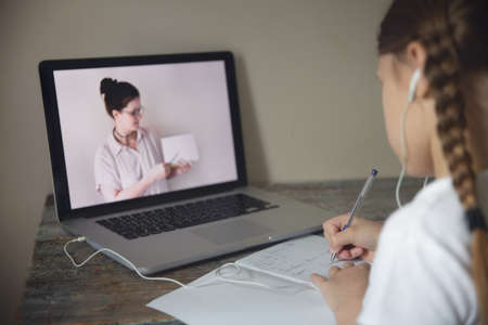 Distance learning-online education. School girl watching online education classes and doing school homework. COVID-19 pandemic forces children online learning.