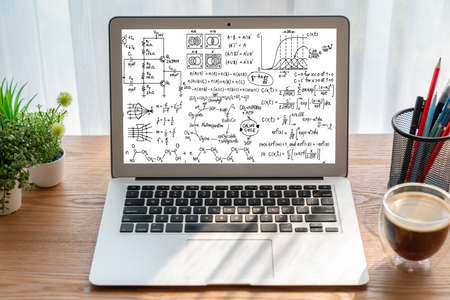 Mathematic equations and modish formula on computer screen showing concept of science and education