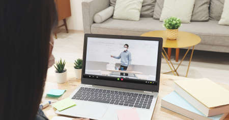 back view of asian asian girl student wearing face mask learns calculus online through laptop and watches male professor teaching at home