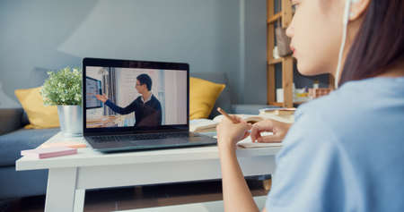 Close-up young Asia girl with casual wear headphones use computer laptop video call learn online with tutor in living room at house. Isolate education online e-learning coronavirus pandemic concept.