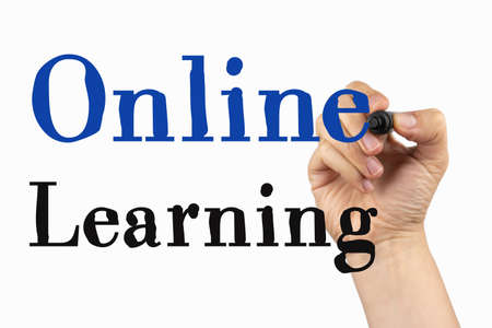 Online learning phrase on a whiteboard, written with black and blue marker in a hand.