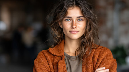 Woman with long, wavy hair smiles warmly in a contemporary office environment.
