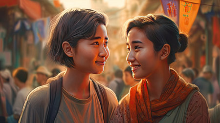 Homosexuality and lifestyle concepts Beautiful student females walking outdoors keeping thier hands together having good mood while meeting each other Smiling lesbians wa : Generative AI