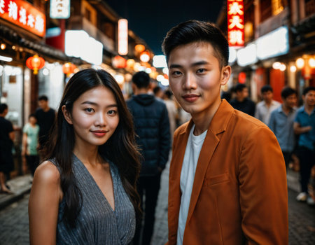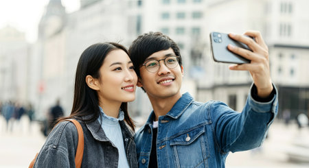 Portrait of a lovely asian couple taking a selfie with mobile phone outdoors in the street.