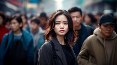 Young Asian woman with a candid expression and natural emotions, standing in front of a blue background, looking directly at the camera