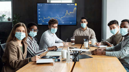 Video conference call. Group of business people discussing business plan while sitting at the table in office.