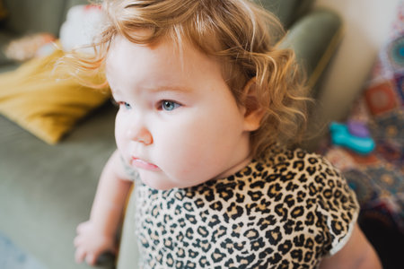 A young child with curls and bright blue eyes stands thoughtfully Dressed in a leopard print shirt they explore their colorful surroundings in a cozy indoor setting that invites play.