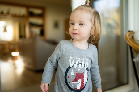 Casual portrait of adorable toddler boy. Cute cheerful child at home.