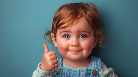 A young female child smiling and showing approval by giving a thumbs up gesture.