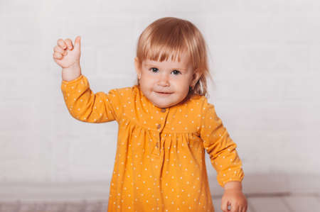 Close-up portrait of blond European little girl smiling. Copy space. Minimal baby