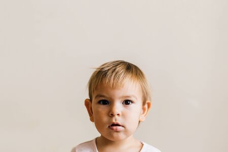 Red-haired baby looks with big eyes. Portrait of a little boy. Surprised baby face.
