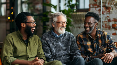 Three joyful men taking a selfie together, showcasing their vibrant personalities and camaraderie. Their genuine smiles and relaxed poses radiate happiness and friendship, capturing a moment of connection and fun