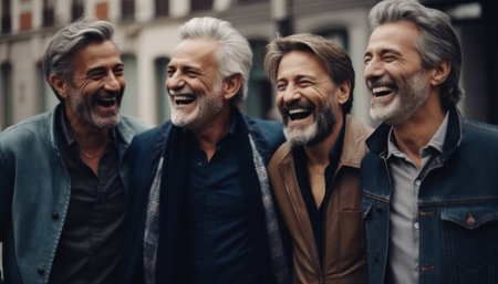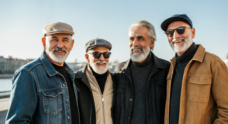 Group of four older men with beards smiling together outdoors. Generated A.I.