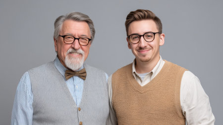 A heartwarming portrait of a grandfather and grandson smiling together in cozy sweaters. The image captures the joy and warmth of familial bonds against a neutral background.