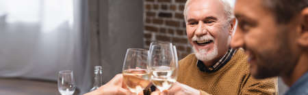 selective focus of excited father and son clinking glasses of white wine during thanksgiving celebration, panoramic crop