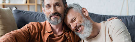 Blurred smartphone in hand of mature man taking selfie with son, banner