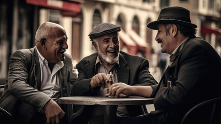 Three Happy Senior Men with Long White Beards and Flat Caps Sitting Together at an Outdoor European Cafe Table, Engaged in Lively Conversation and Enjoying Their Coffee Break.