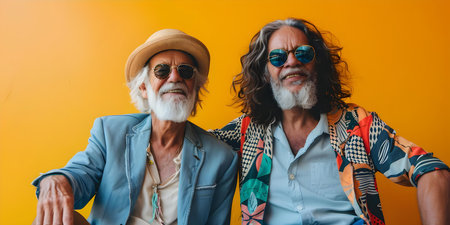 Two stylish older men dressed in bright street funky clothes, modern sunglasses on a bright pastel wall. Generative AI